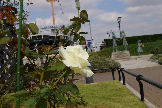 モデルが存在する「赤い靴はいてた女の子の像」です 公園に面して横浜マリンタワーもそびえています。
